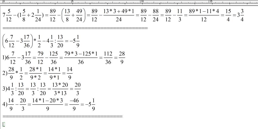 Решите: 1)4(целых)5/14+(5(целых)1/12-3(целых)4/2)= 2)7(целых)5/12-(1(целое)5/8+2(целых)1/24)= 3) (6(целых)7/12-3(целых)17/36)(умножить*)1/2-4(целых)1/3:13/20= 4) (1(целое)11/24+13/16)*1(целое)11/25-8/15*9/16= 5) 2(целых)1/2-48-3(целых)2/3:1/18+5(целых)5/12:7/36=