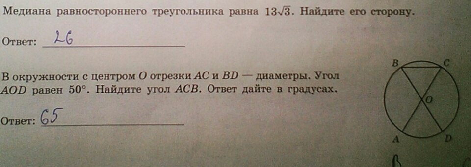 угол AOD=углу BOC как вертикальные, и т.к. мера углов треугольника равна 180 градусов, а треугольник ВОС равнобедренный т.к. ВО=ОС как радиусы, угол АСВ= (180-50)/2=65 градусов.