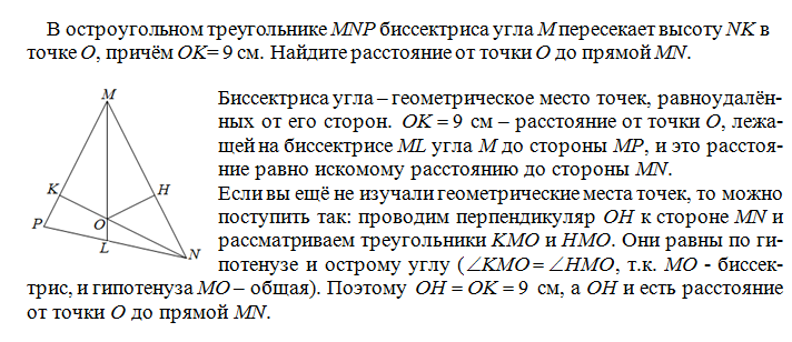 ОЧЕНЬ СРОЧНО!!! в остроугольном треугольнике MNP биссектриса угла М пересекает высоту NK в точке О ,причём ОК= 9 см .Найдите расстояние от точки О до прямой MN.