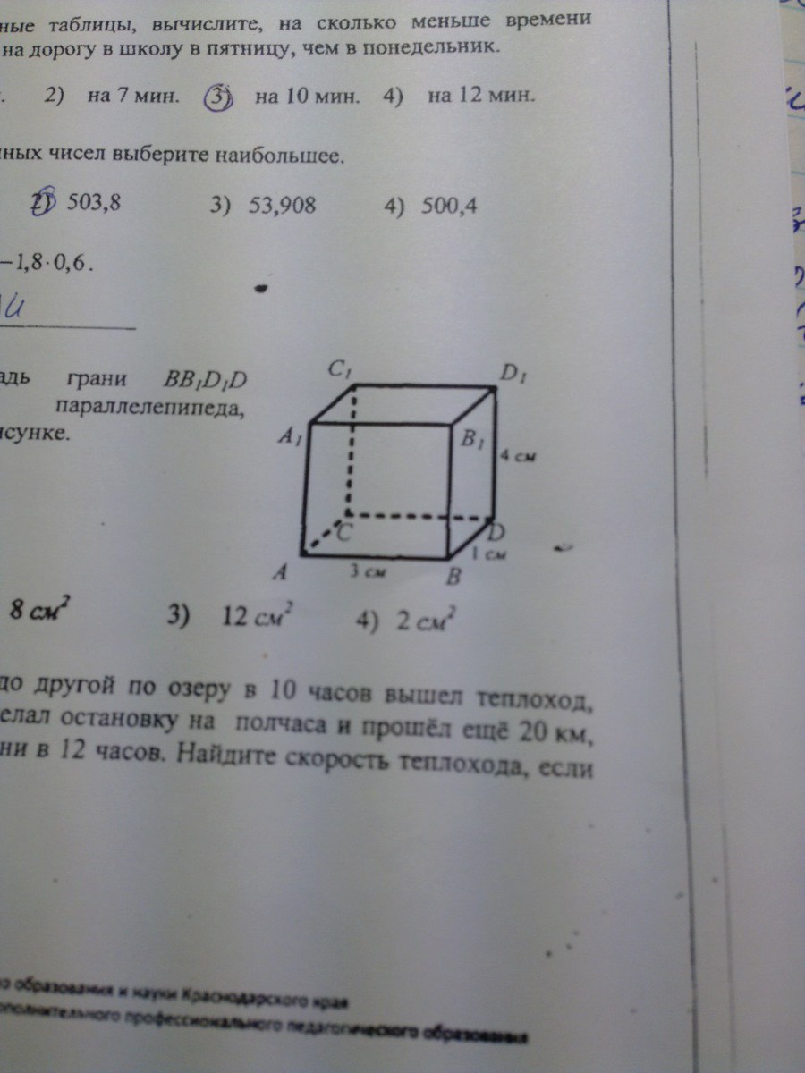 найдите площадь грани BB1 D1 D прямоугольного параллелепипеда изображенного на рисунке