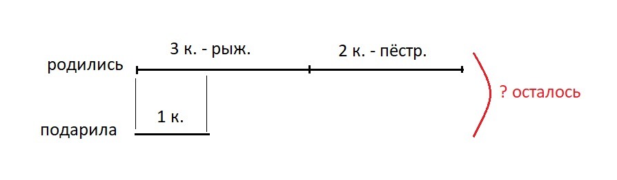 у Олиной кошки родились 3 рыжих котенка и 2 пестрых. Оля подарйла 1 котенка подруге. Сколько котят осталось ? помагите сделать схему к задаче