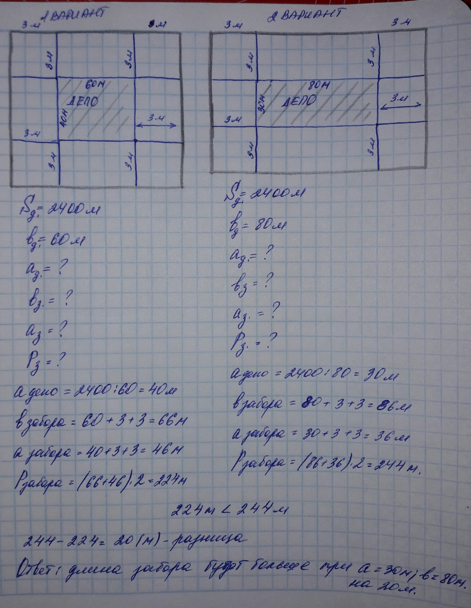 Железнодорожное депо Должно иметь примаугльную форму и занимать участок площадь 2400м предложено два варианта строительства депо по одному из них длина депо 80м а по другому 60м вокруг депо в 3м от его стен должен быть возведён железобетонный забор по какому варианту длина забора будет больше и на сколько метров