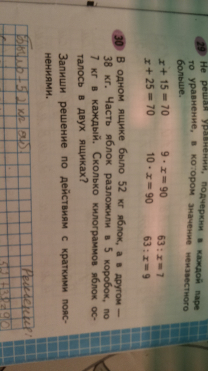 1)52+38=90 > столько яблок в двух ящиках было <br />2)5×7=35 > столько яблок разложили в 5 ящиках <br />3)90-35=55 > столько стало яблок в 2 ящиках после того как их разложили