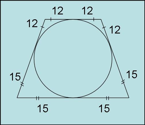 в равнобедренную трапецию вписана окружность. Боковая сторона точкой касания делится на отрезки 15 и 12. Найти основания трапеции, но в ответ записать их произведения.
