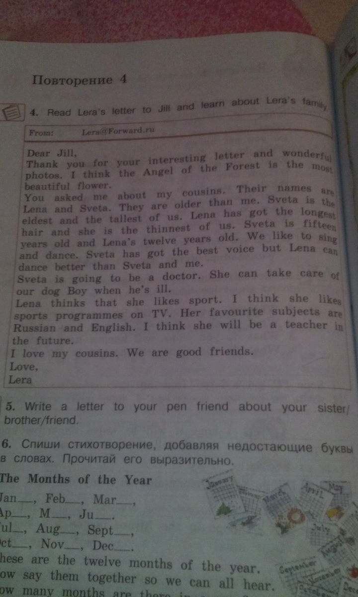 Диа Джилл, сэнк ю фо ю интерестинг лэттэ энд вандефул фотоус. Ай синк зе Энджел оф зе Форест ис зе мост бьютифул флаувер. Ю аскид ми эбаут май казинс. Зеа нэимс а Лена энд Света. Зей а олдэ зен ми. Света ис зе элдест энд зе толлест оф аз. Лена хэз гот зе лонгест хэа энд щи ис зе синнест оф аз. Света ис фифтин еарз олд энд Ленас твэлв еарз олд. Ви лайк ту Синг энд данс. Света хэз гот зе бест воис бат Лена кэн данс бетте зен Света энд ми. (тут не до конца)