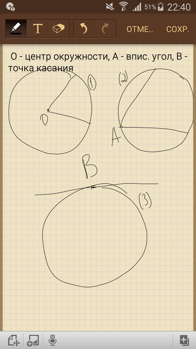 центр. угол(1) и впис.угол (2), касательная к окружности(3) - на картинке