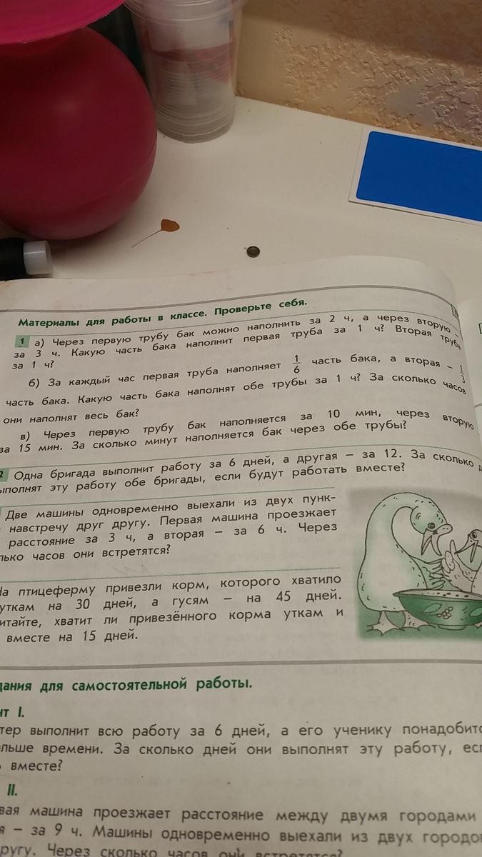 б) 1/6+1/3=1/6+2/6=3/6=1/2-часть бака наполняют обе трубы
