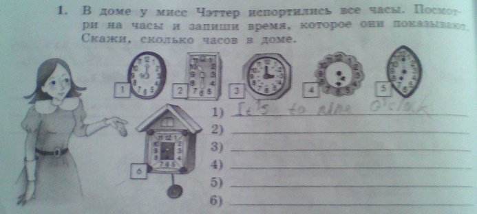 в доме у Мисс чэттер испортились все часы Посмотри на часы и запиши время которое не показывает Скажи сколько часов в доме английский
