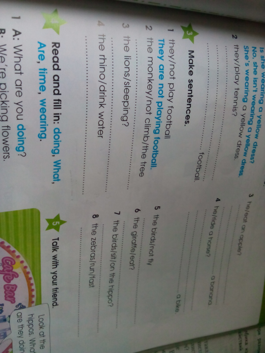 1)the monkey is not climb the tree.2)are the lions sleeping?3)the rino is drink water4)the birds are not fly.5)is the giraffe eat?6)are the birds sit on the hippo.7)the zebras are run fast.