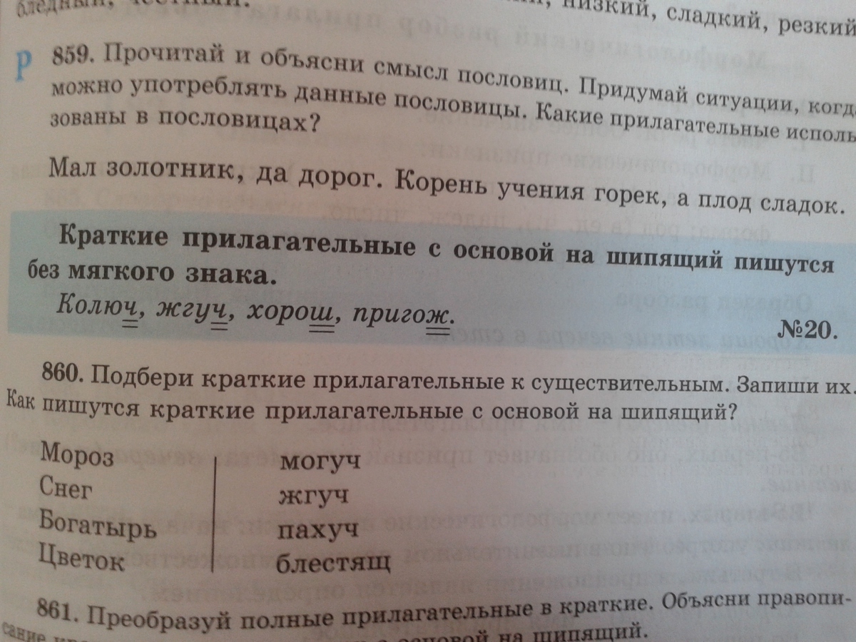 №860 Краткие прилагательные с основой на шипящий пишутся без мягкого знака.