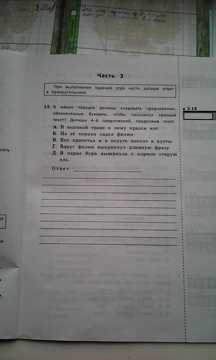 На её корнях сидел филин. В высокой траве к нему крался кот. В друг филин выкрикнул длинную фразу. „В парке буря вывернула с корнем старую ель!"Кот привстал и в испуге пополз в кусты. От испугу у кота волосы встали дымом. Побежал он домой быстро,быстро. Забегает домой и быстро под кровать.