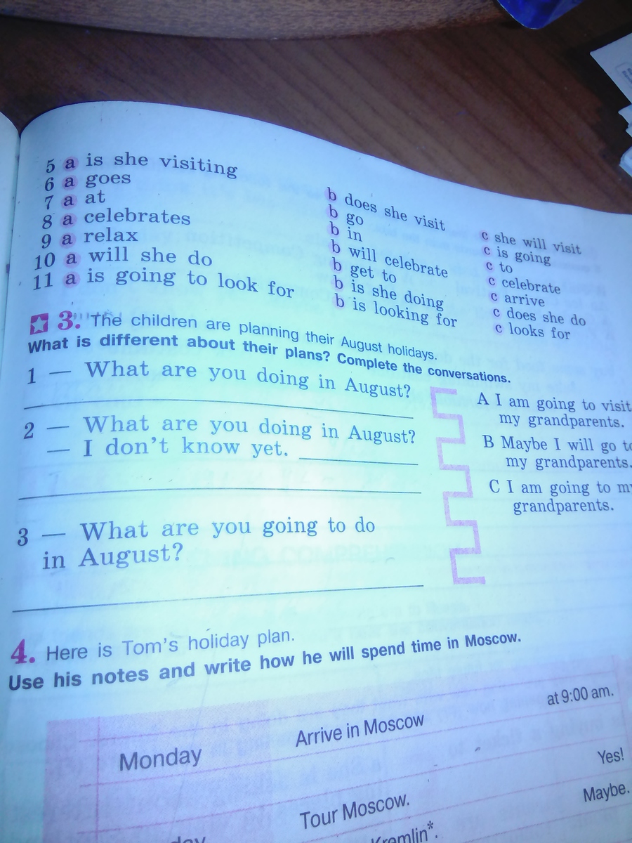 1___ c (что ты обычно делаешь в августе т.е. обычные действия) 2_____ ( там оговорка. Я не знаю - "может быть" я что то сделаю.(момент речи) b 3_______ a ( я собираюсь только сделать что то (но не факт что сделаю планы)