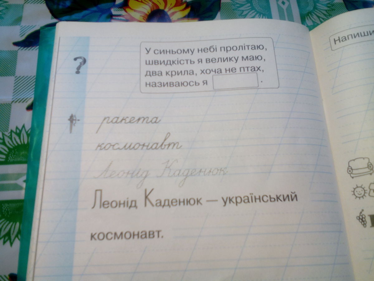 єто я поняла,мнетнадо с низу тетради там где написано Леонід Каденюк украинский космонавт.