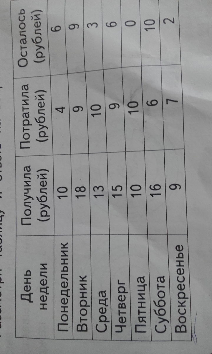 Маша записала в таблицу каждый день в течении недели, сколько денег она получила от папы,какую сумму потратила и сколько денег у нее осталась. Рассмотрим таблицу и ответ на вопрос