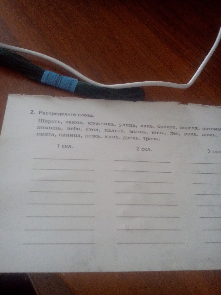 1 скл. мужчина,замок(не уверен),улица,неделя,синица,книга,рука,трава.2 скл. болото,автомобиль(я не вижу что там с краю,скорее всего автомобиль),небо,стол,пальто,лес,кино,3 скл. шерсть,лань,помощь,мышь,ночь,ложь,рожь,дрель. И все)))