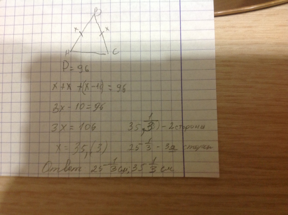периметр равнобедренного треугольника равен 96 см, одна его сторона меньше другой на 10 см, вычеслите длины сторон
