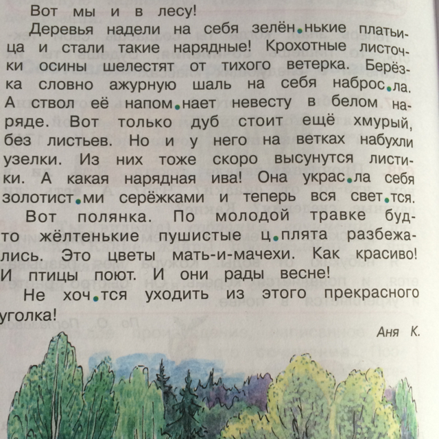 деревья надели на себя зеленые платьица, Березка словно ажурную шаль на тебя набросила, а ствол ее напоминает невесту в белом наряде, дуб стоит еще хмурый, она украсила себя золотистыми сережками и теперь вся светится, будто желтенькие пушистые цыплята разбежались.