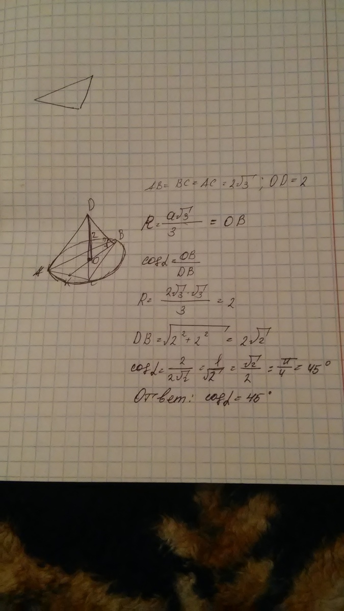 В правильной треугольной пирамиде сторона основания равна 2корень из 3, а высота 2 см.. Найти угол наклона бокового ребра к плоскости основания. Ответ запишите в градусах