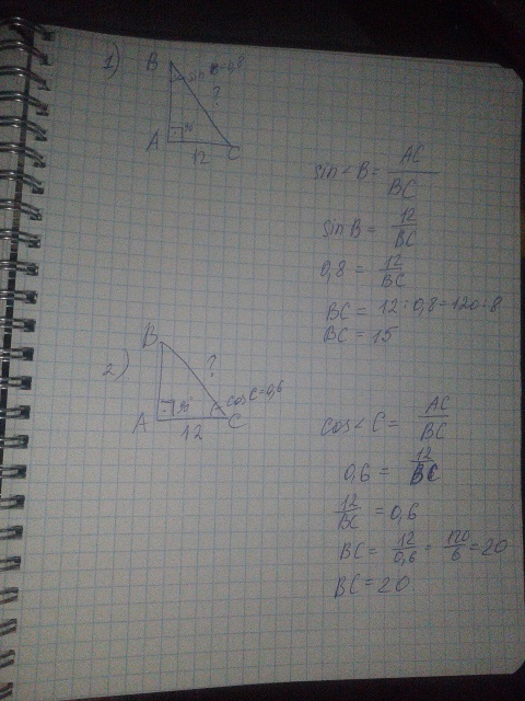 1)в треугольнике АВС угол А прямой,АС=12см, sin угла АВС=0.8.Найдите ВС