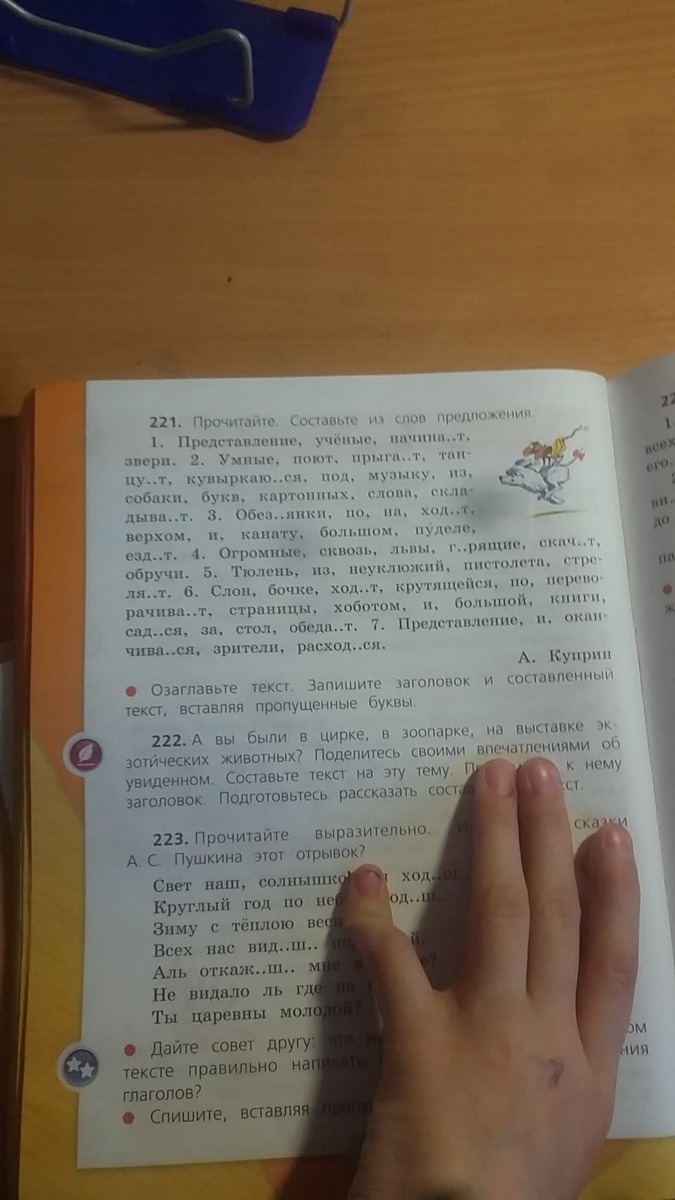 Учёные звери начинают представление. Умные собаки прыгают, танцуют, поют, кувыркаются под музыку, из картонных букв складывают слова. Обезьянки верхом ездят на большом пуделе и ходят по канату. Огромные львы скачут сквозь горящие обручи. Неуклюжий тюлень стреляет из пистолета. Слон ходит по крутящейся бочке, переворачивает страницы книги хоботом и садится за большой стол обедать. Представление оканчивается и зрители расходятся.