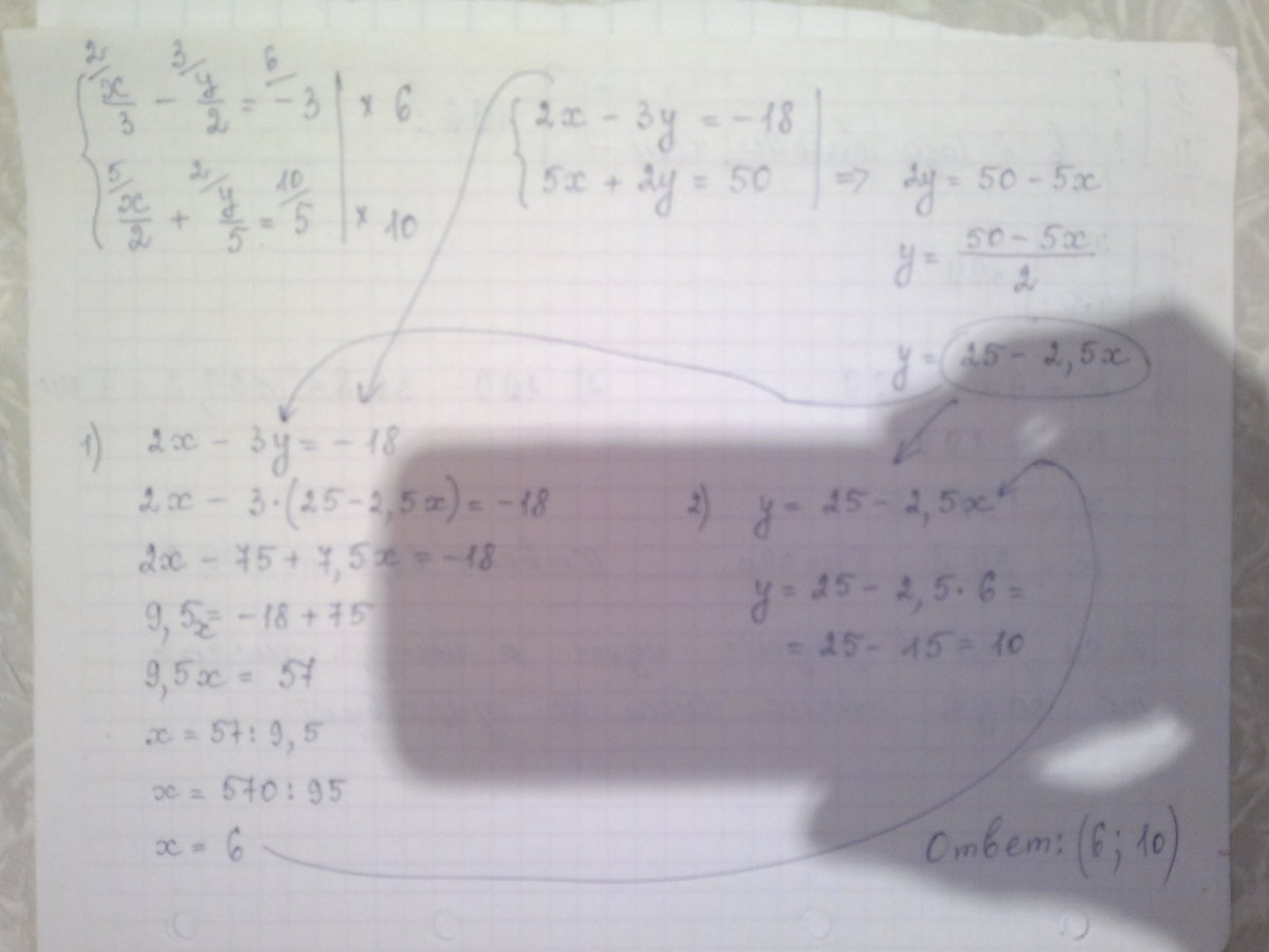 решить систему уравнений способом подстановки:{x/3-y/2=-3{x/2+y/5=5 объясните пожалуйста как это решается