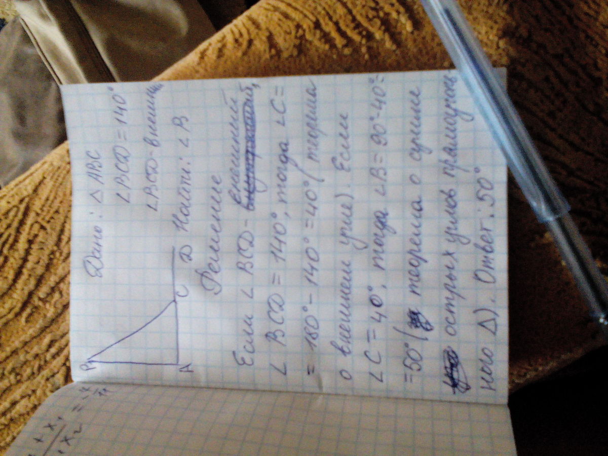 В прямоугольном треугольнике abc угол а-прямой внешний угол при вершине c равен 140 градусов найти угол B