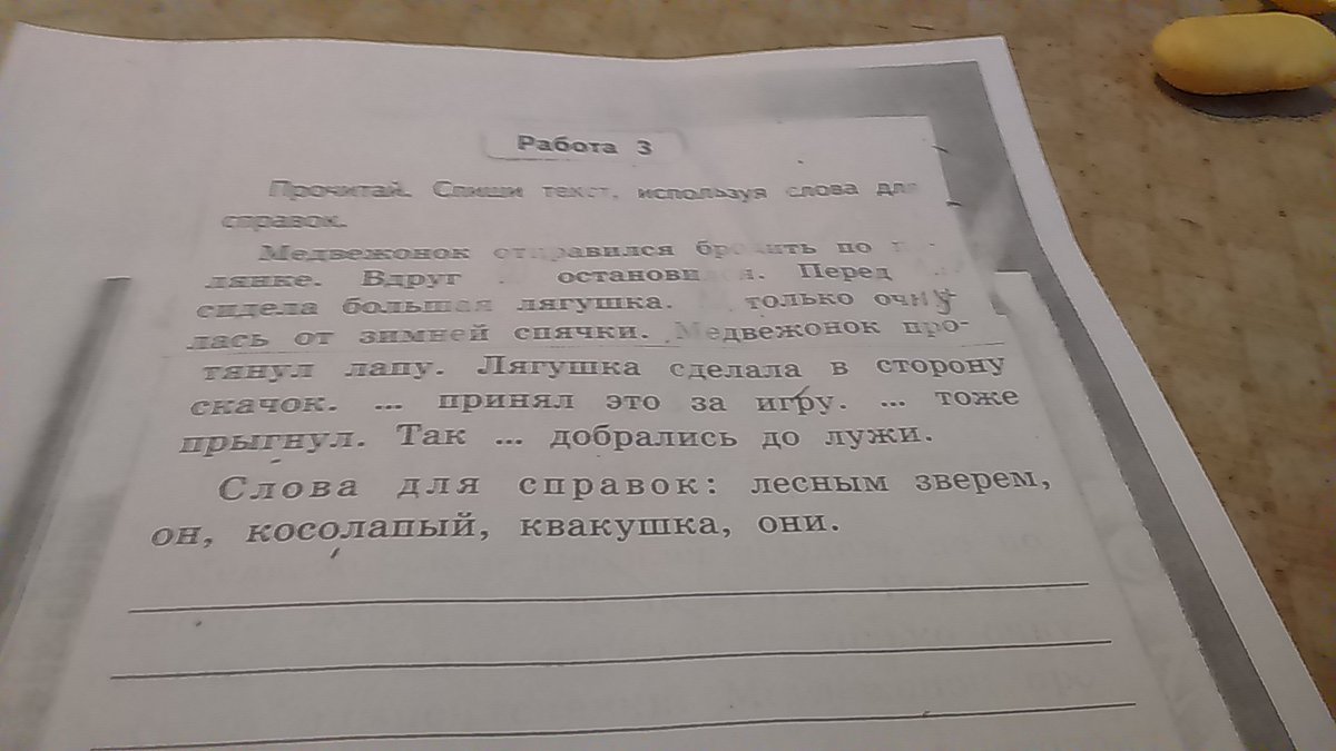Медвежонок отправился бродить по полянке.Вдруг он остановился.Перед лесным зверем сидела большая лягушка.Квакушка только очнулась от зимней спячки.Медвежонок протянул лапу.Лягушка сделала в сторону скачок.Косолапый принял это за игру.Он тоже прыгнул.Так они добрались до лужи.
