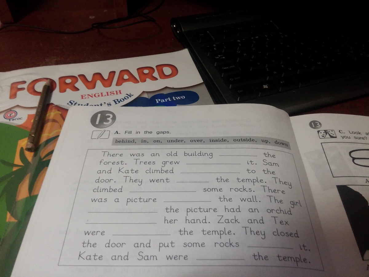 There was an old building in the forest. Trees grew ower it. Sam and Kate climbed under to the door. They went to the temple. They climbed up some rocks. There was a picture on the wall. The girl in the picture had an orchid behind her hand. Zack and Tex were inside the temple. They closed the door and put some rocks under it. Kate and Sam were outside the temple.