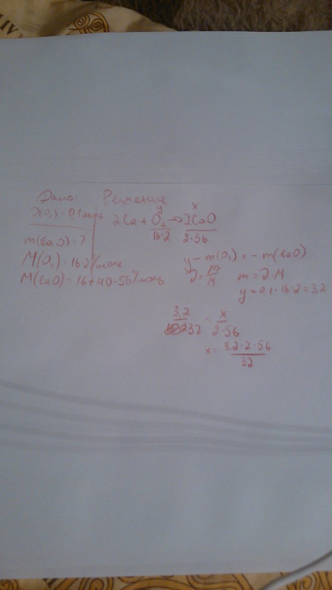 используя химическое уравнение 2Са+О2=2СаО рассчитайте массу образовавшегося оксида кальция СаО,если в реакцию вступил кислород количеством вещества 0,1 моль.