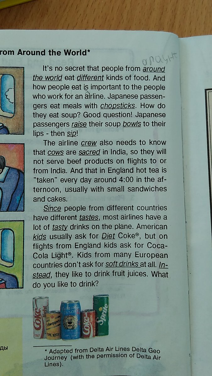 Вокруг света * Ни для кого не секрет, что люди со всего мира едят различные виды пищи. И как люди едят очень важно для людей, которые работают на авиакомпании. Японские пассажиры едят блюда с палочками для еды. Как они едят суп? Хороший вопрос! Японские пассажиры поднимают миски к губам Затем экипаж авиакомпании также должен знать, что коровы являются священными в Индии, так что они не будут служить продукты из говядины на рейсах в или из Индии. И что в Англии горячий чай "принято" каждый день около 4:00 в всенародной ternoon, как правило, с небольшими бутербродами и выпечкой. Так как люди из разных стран имеют разные вкусы, большинство авиакомпаний имеют много вкусных напитков на самолете. Американские дети обычно просят Diet Cokee, но на рейсах из Англии дети просят Coca-Cola Light. Дети из многих европейских стран, не просят Softorinks вообще. Вместо этого, они любят пить фруктовые соки. Что Вы хотели бы пить?
