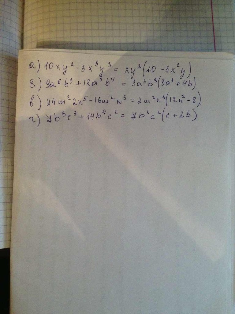 а) 10xy^2-35x^3y^3; б) 9a^6b^3+12a^3b^4; в)24m^2n^5-16m^2n^3; г) 7b^3c^3+14b^4c^2.