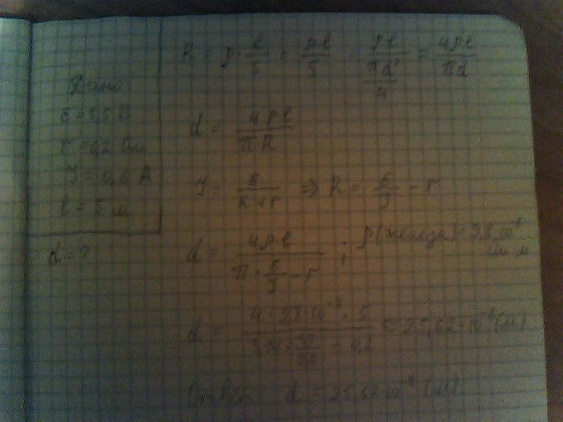 Каким должен быть диаметр железного проводника, чтобы, замкнув им элемент с э.д.с. 1,5 В и внутренним сопротивлением 0,2 Ом, получить силу тока 0,6 А? Длина проводника равна 5,м.
