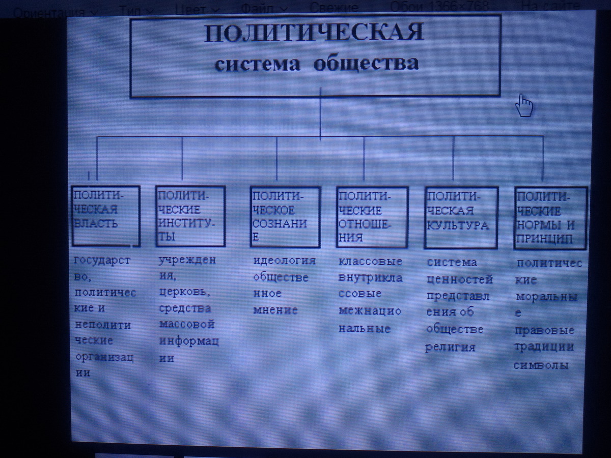 Политическая система→политическая власть→политические инструменты→политическое сознание→политическое отношения→политическая культура →политические нормы и принципы