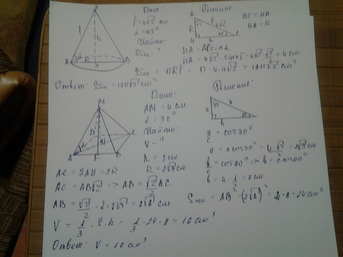 2.Боковое ребро правильной пирамиды МАВСД составляет 4см и образует с плоскостью угол основания 30. Найдите объем пирамиды.