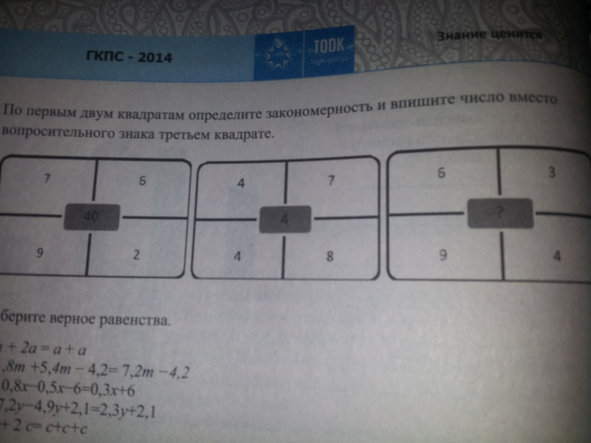 по первым двум квадратам определите закономерность и впишите число вместо вопросов знака третьем квадрате
