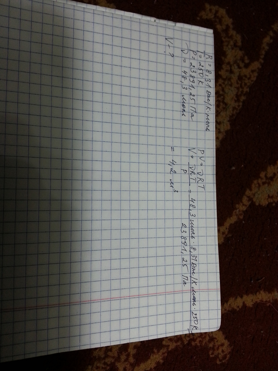 Закон Менделеева-Клапейрона можно записать в виде PV = νRT, где P — давление (в паскалях), V — объём (в м3), ν — количество вещества (в молях), T — температура (в градусах Кельвина), а R — универсальная газовая постоянная, равная 8,31 Дж/(К⋅моль). Пользуясь этой формулой, найдите объём V (в м3), если T = 250 К, P = 23 891,25 Па, ν = 48,3 моль.