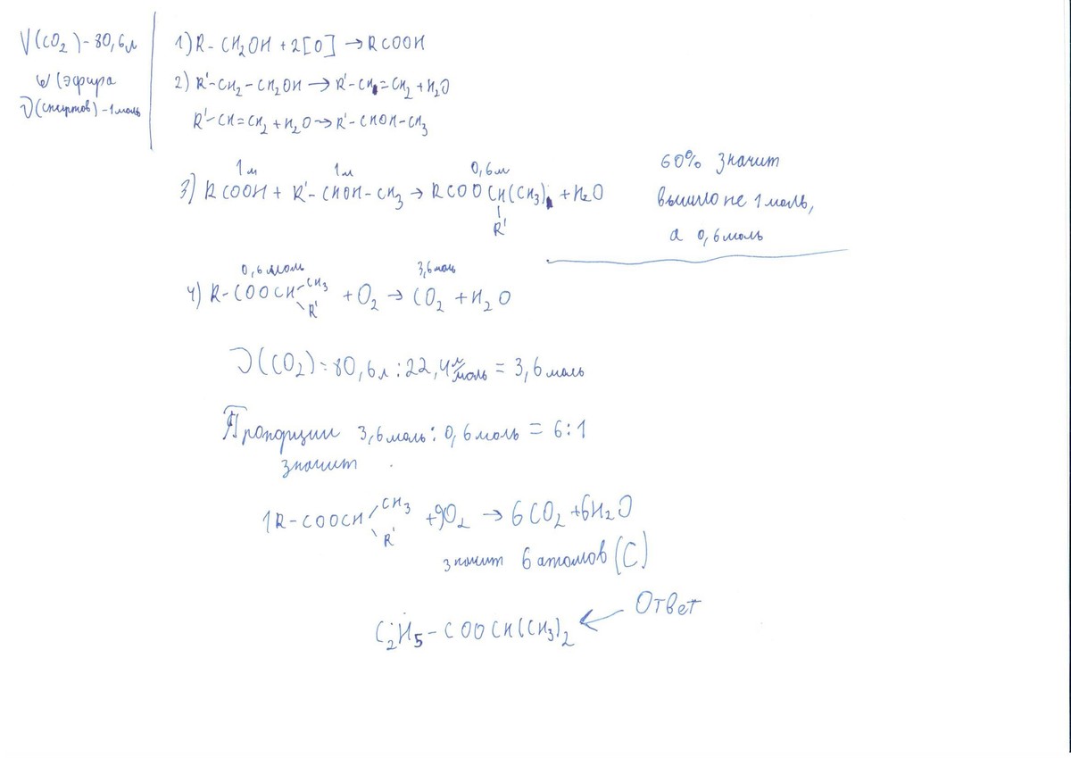 Моль насыщенного одноатомного спирта окислили в кислоту. Такое же количество спирта дегидратировали, а затем гидратировали. Из полученных в результате этих реакций продуктов синтезировали сложный эфир, при сгорании которого образуется 80,6 л (н.у.) углекислого газа. Какое строение имеет сложный эфир, если его выход составляет 60%, а остальные реакции протекают количественно.