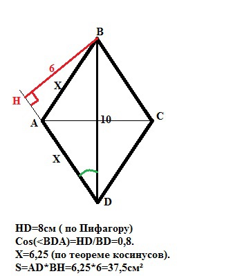 HD=√(ВD²-ВН²)=√(100-36)=8см. Тогда Cos(<BDA=8/10 (прилежащий катет к гипотенузе). В ромбе все стороны равны. Пусть АВ=АD=Х.