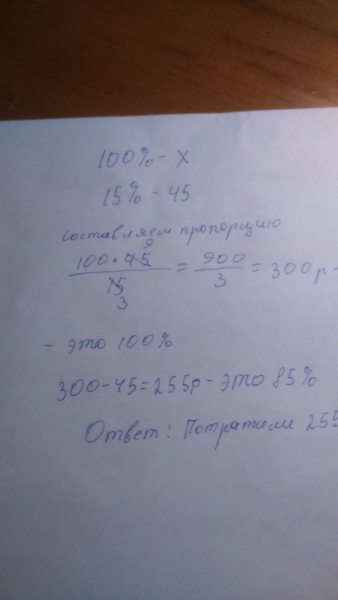 после того как потратили 85% денег осталось 45 сколько денег потратили Напишите решение пожалуйста