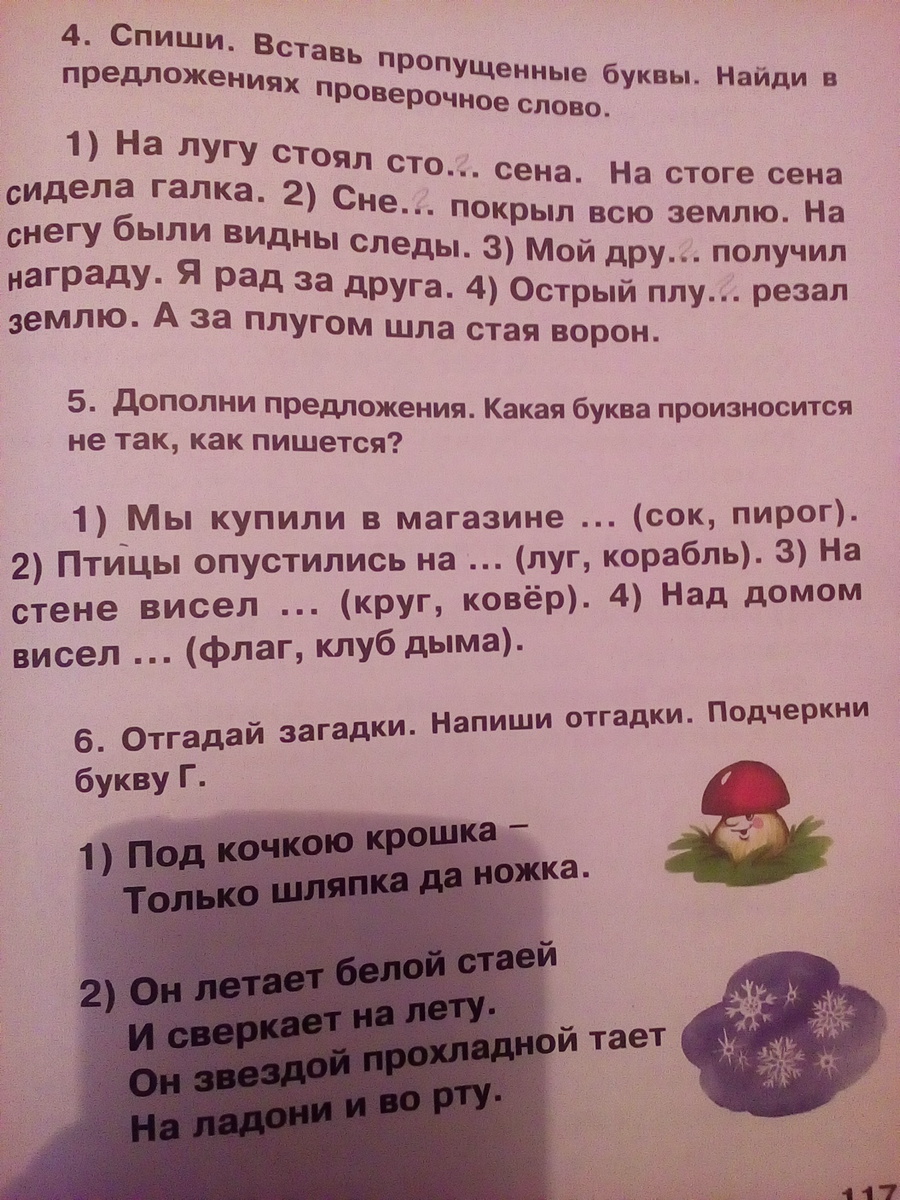Мы купили в магазине пирог. Птицы опустились на луг. На стене висел круг. Над домом висел флаг.