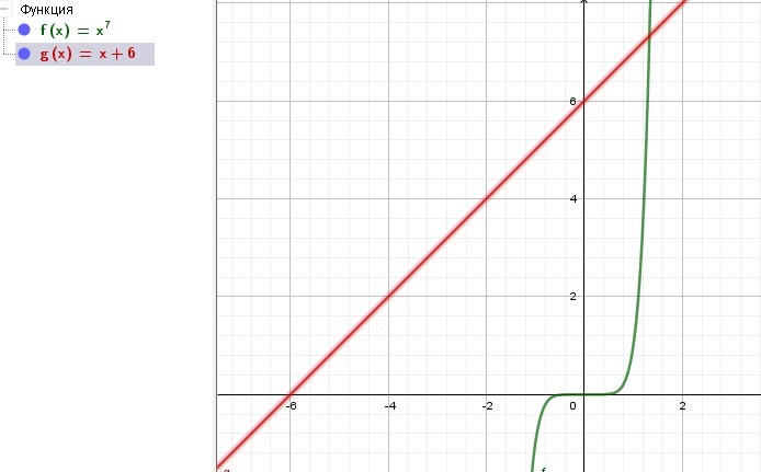 графики пересекаются в одной точке, следовательно, уравнение имеет один действительный корень и 6 комплексно-сопряженные корни.