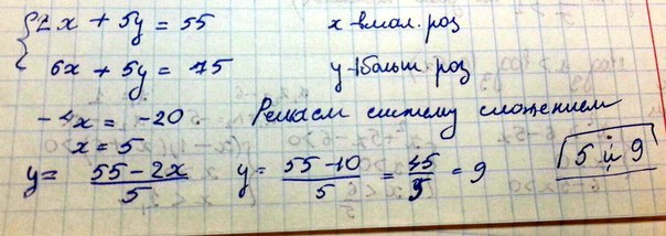 Составили одинаковые большие и одинаковые маленькие букеты роз. В двух маленьких и пяти больших букетах было 55 роз, а в шести маленьких и пяти больших - 75 роз. Сколько роз было в каждом букете? Решение!!!!!!!!!!!!!