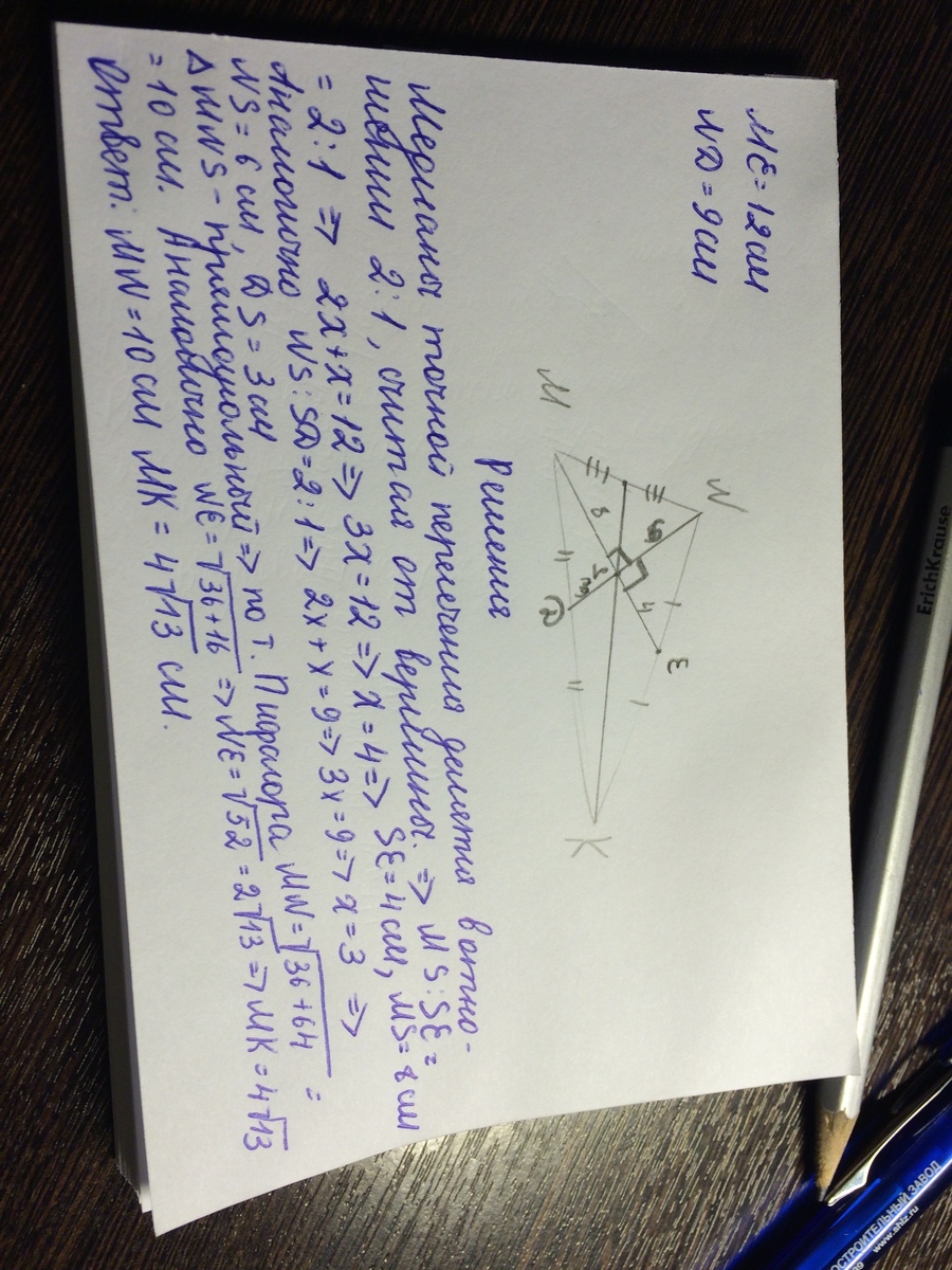 Медианы ND и ME треугольника MNK пересекаются в точке S. ME = 12 дм, ND = 9 дм, и угол MSN равен 90 градусов. Нарисуйте чертёж треугольника и если можно найдите стороны MN и NK треугольника MNK