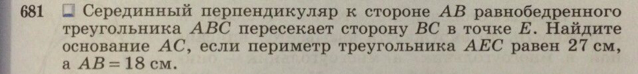 Е принадлежит де, а значит ае=ве=> ас=(ас+ае+ес)-(ае+ес)=(ас+ае-ес)-(ве+ес)=(ас+ае-ес)-вс=27см-18см=9см.