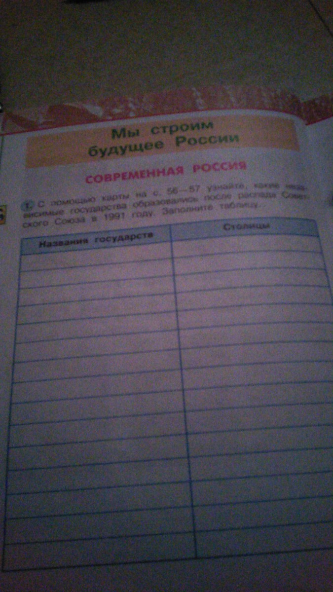 с помощью карты на с.56-57 узнайте,какие независимые государства образовались после распада Советского Союза в 1991 году.Заполните таблицу.