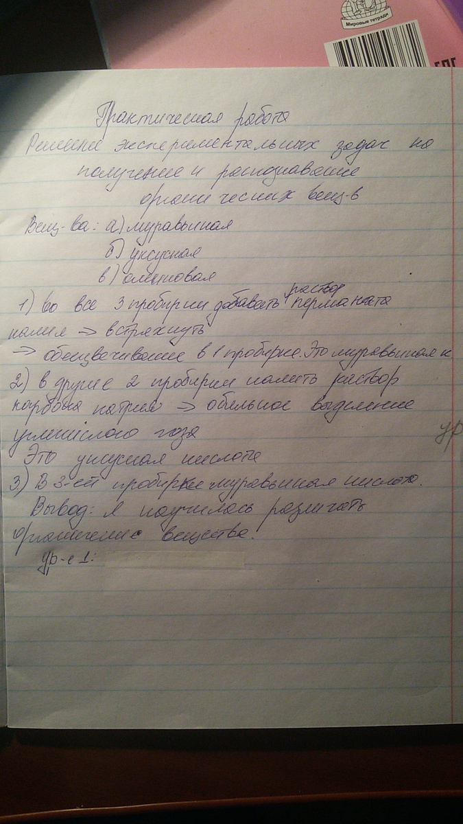 В третьей пробирке ничего не наблюдаем, там находится олеиновая к-та - С17Н33СООН, в 1-й муравьиная под действие окислителя она переходит в угольную кислоту, которая разлагается на СО2 и Н2О