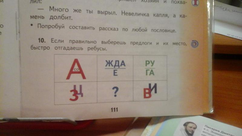 Может, и так быть. У Вас там тема предлоги, посмотрите. какие изучали, и какие использовали в ребусах, они все разные. тот , который еще не использовали. будет в этом странном ребусе