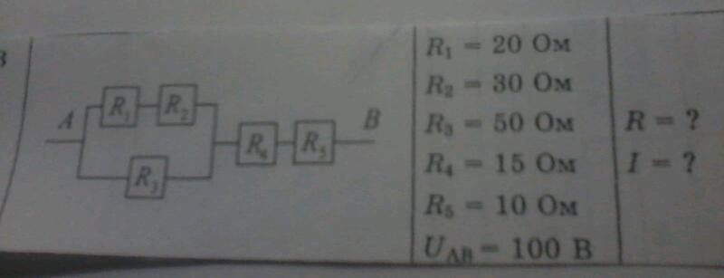R1+R2=20+30=50, 1/50+1/50=1/R - R= 25ом, Rобщее=25+15+10=50ом, I=U/R=100/50=2A