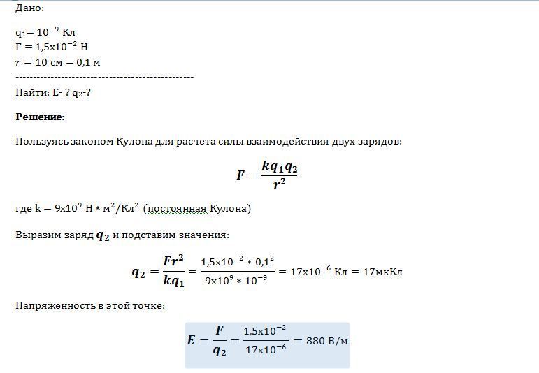 На расстоянии 10 см от заряженного шарика на заряд q= 10^{-9}Кл действует сила F=1.5*10^{-2} Н. Найдите напряженность поля в этой точке и определите заряд шарика. помогите пожалуйста, подробно, с формулами...........