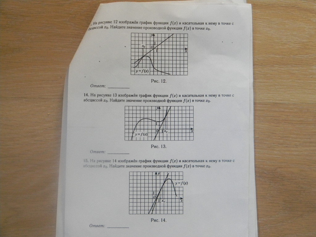 №10. - 0,5. №12.0,5. №13. 3/4. №14. 2 №15. 2 Значение производной в точке касания - угловой коэффециент касательной прямой, тангенс угла наклона касательной. Между касательной и положительным направлением оси Ох. Если этот угол тупой, ставим знак минус, если острый - знак плюс.Вас заинтересует